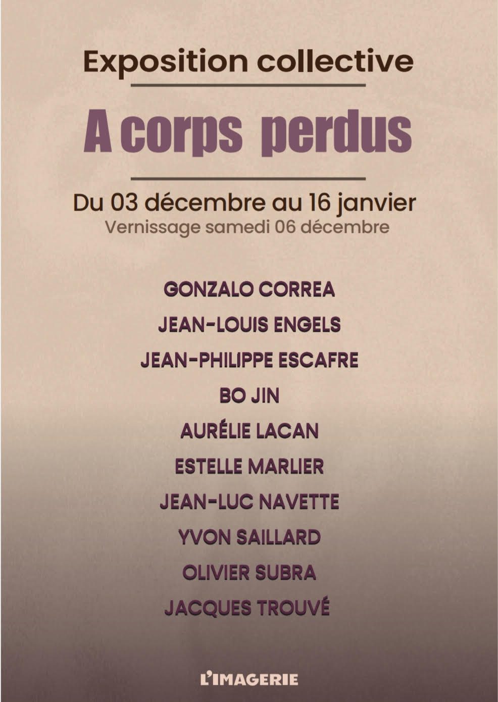 La galerie l'Imagerie est heureuse de vous présenter l'exposition collective : "À corps perdus" ! Avec Gonzalo Correa, Jean-Louis Engels, Jean-Philippe Escafre, Bo Jin, Aurélie Lacan, Estelle Marlier, Jean-Luc Navette, Yvon Saillard, Olivier Subra et Jacques Trouvé. Autour de la thématique de la transfiguration du corps, les artistes de la galerie sont invités à questionner sa représentation contemporaine, jusqu'à sa déconstruction, voire sa disparition. Rendez-vous le samedi 6 décembre à partir de 18h30 pour le vernissage de l'exposition en présence des artistes.